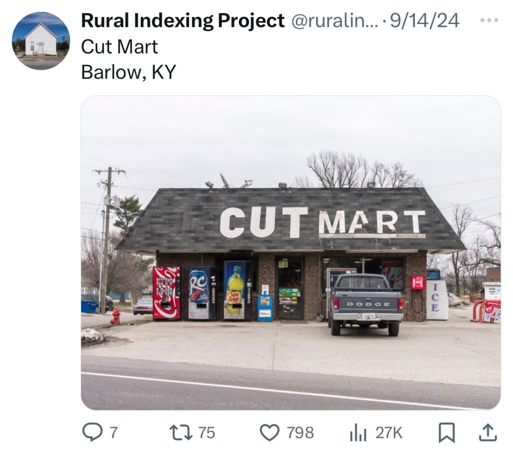One of my favorite Twitter accounts is the Rural Indexing Project, an initiative dedicated to cataloguing architectural and semiological trends in rural America. Not to be “that guy,” but I feel that these spaces, usually devoid of people, occupy a liminal space that’s really compelling. Many of these businesses and residential buildings are at risk of vanishing as the populations of these small towns dwindle, imbuing them with an existential vibe that is meditative.